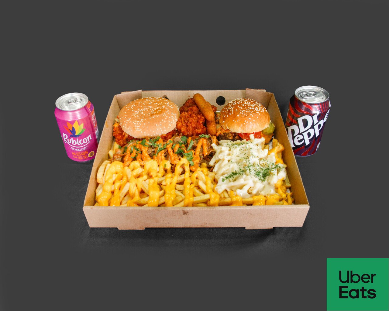 A Smash burger, a crispy Dip burger or Classic Fillet burger , stir fried donner topped with sauce of your choice , chips with sauce of your choice,, 2 fried wings, portion of home made mac&cheese, 2 mozzarella sticks, and 2 can of any drinks.